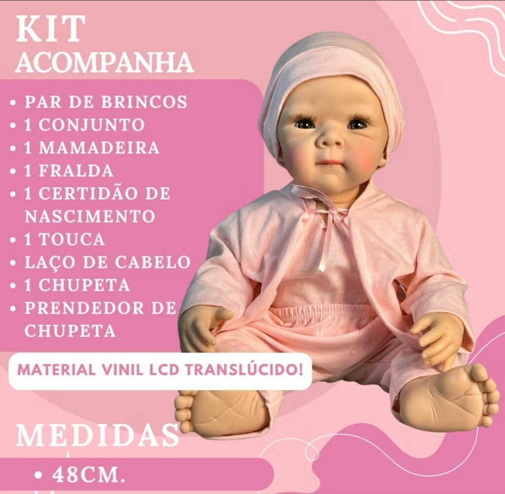 Esta boneca é 100% de silicone, com pintura delicada e um corpinho de vinil siliconado macio. Com aproximadamente 44 cm de altura e 800g de peso, ela é um item de qualidade que sua criança merece.